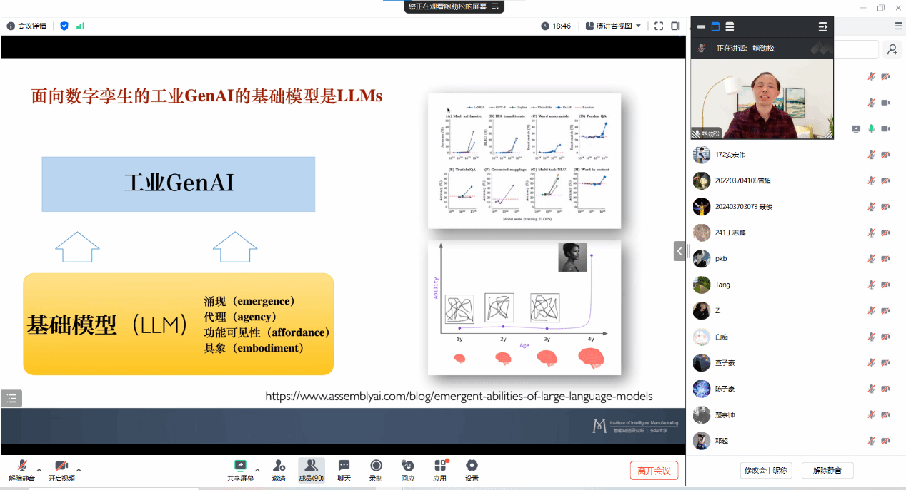 接着,鲍教授对工业 GenAI 技术进行了系统讲解,特别提到了大语言模型的 “百模大战”,展示了不同层级的 AI 服务和关键组件,让与会者对当前工业 AI 技术的格局有了清晰的认识。此外,鲍教授还对比了 “陆奇三位一体结构演化模式” 与 “数字孪生三位一体结构演化模式”,强调了在智能制造环境下信息、模型和行动系统之间的紧密联系。