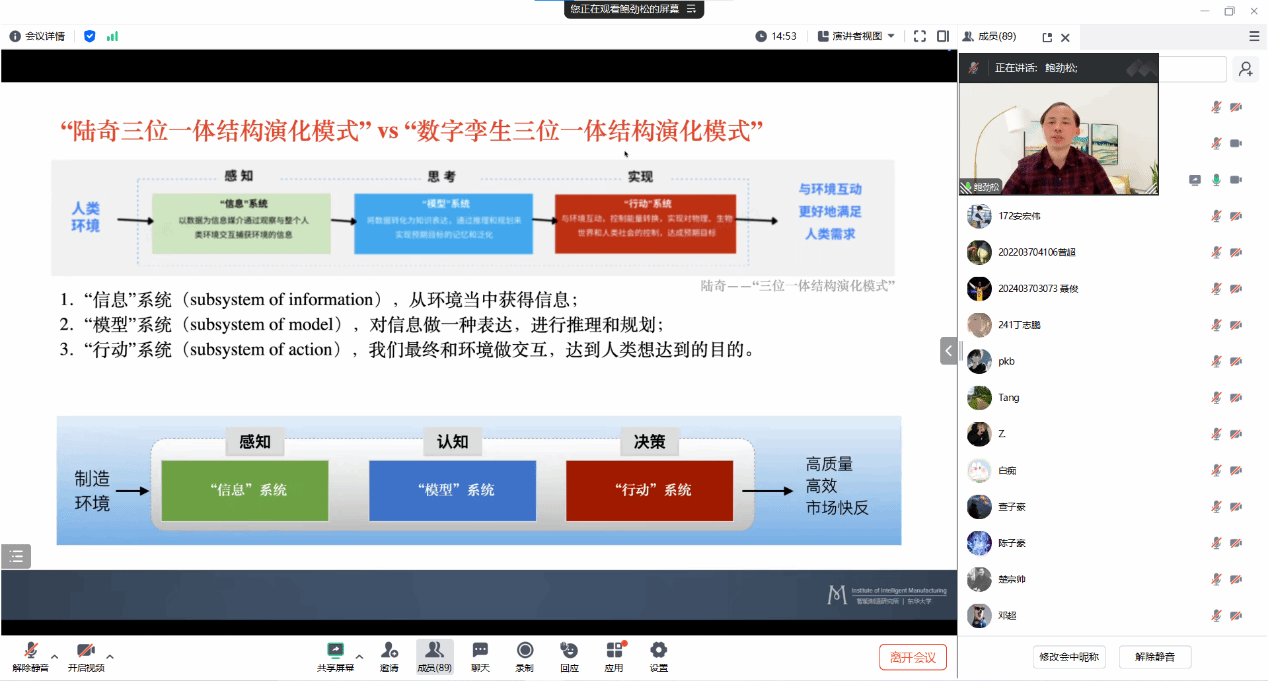 武科大网讯(通讯员 戴路)为深入探索智能制造,数字孪生前沿技术,11月28日晚,东华大学best365官方网站登录入口智能制造研究所所长鲍劲松教授应邀在腾讯会议作题为《数字孪生与工业GenAI技术》学术报告。本次报告由金装备及其控制教育部重点实验室机械传动与制造工程湖北省重点实验室联合主办,吸引了线上线下一百余名师生参与。
